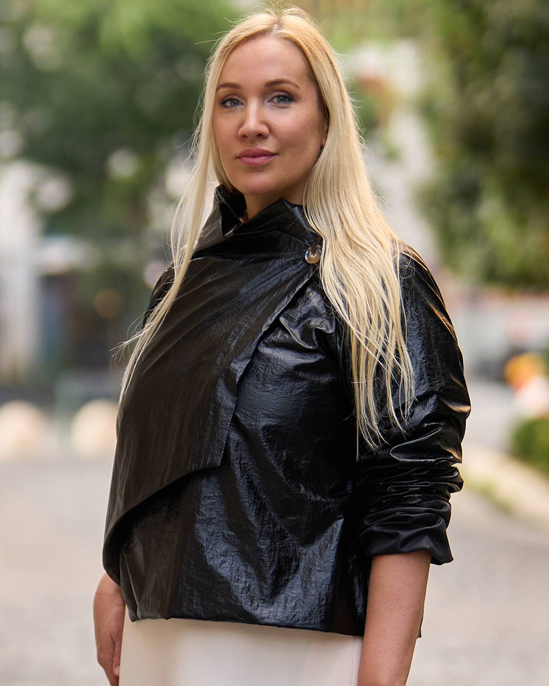 Modell magassága 165 cm, mellbősége 110 cm, derékbősége 100 cm, csípőbősége 120 cm