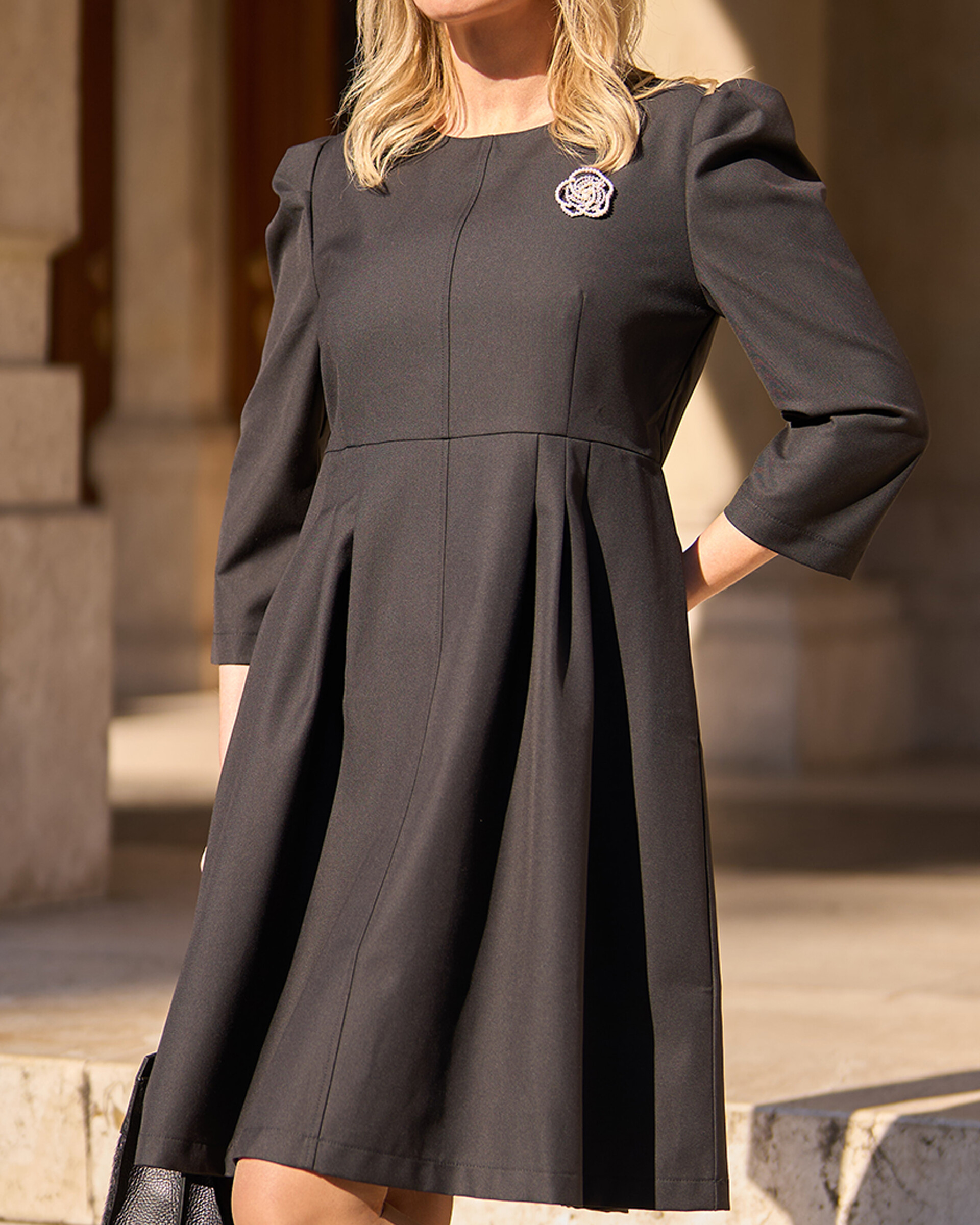 Fekete puffos ujjú térdig érő ruha, elején kitűzővel