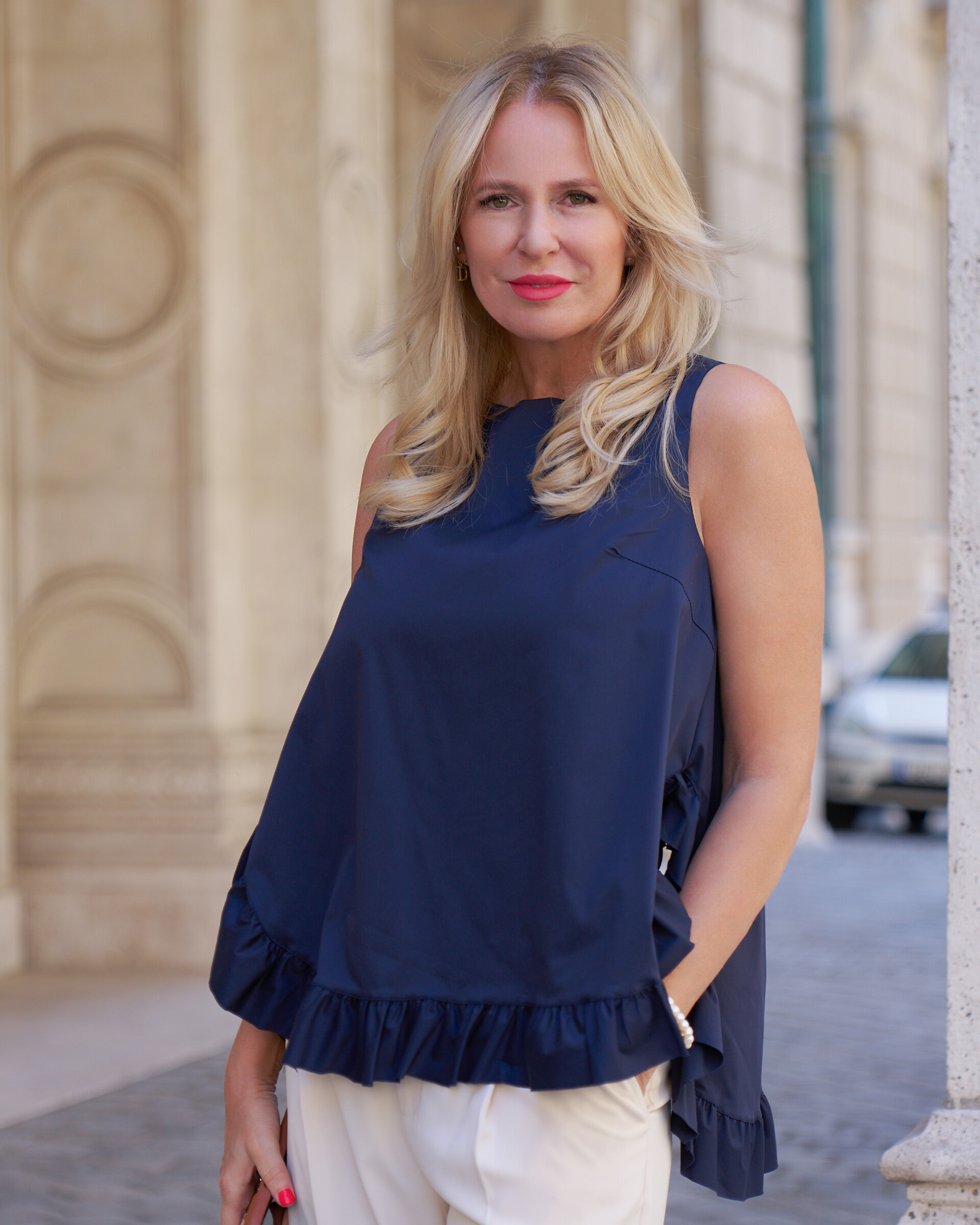 Sötétkék hátul nyitott fodros puplin felső