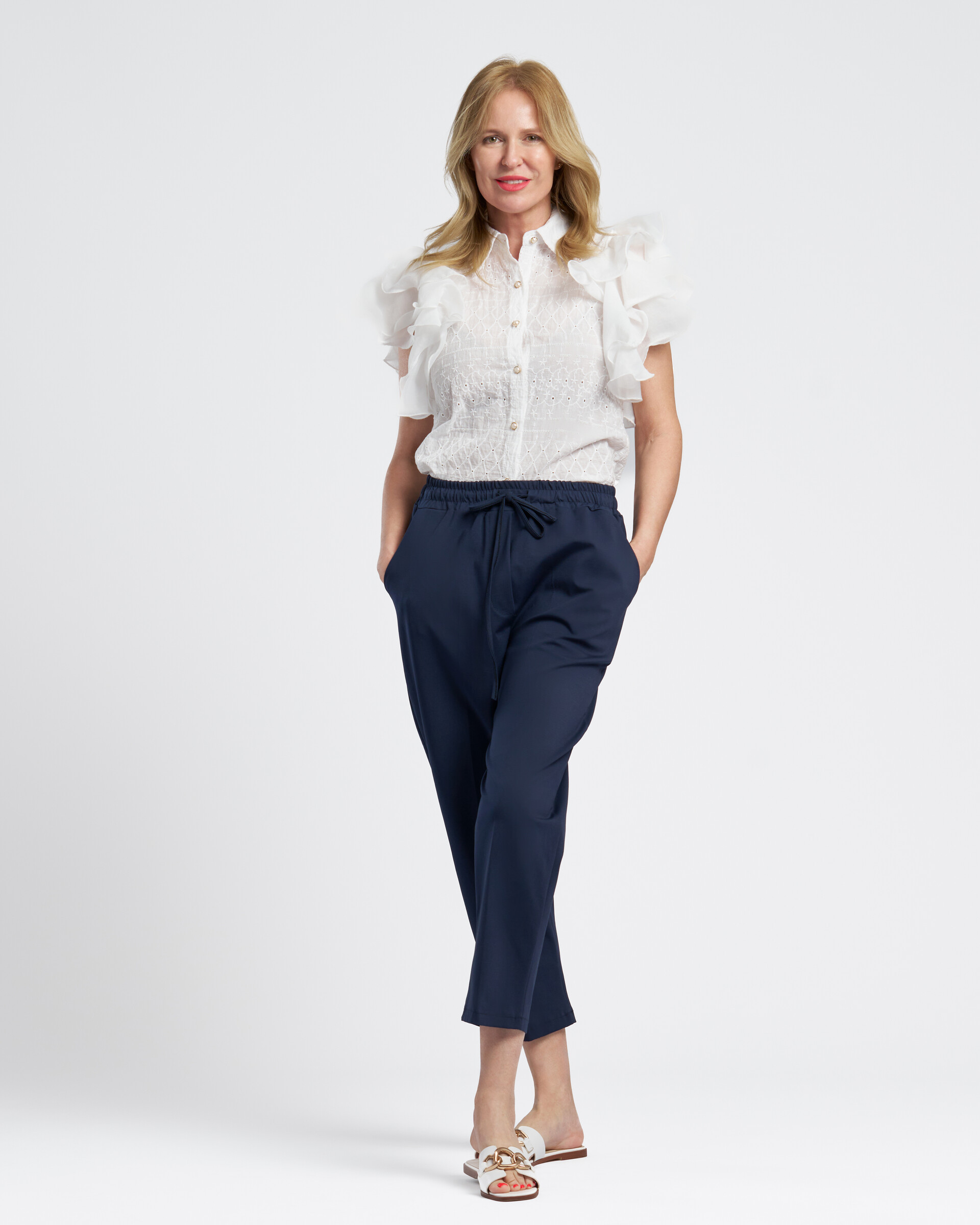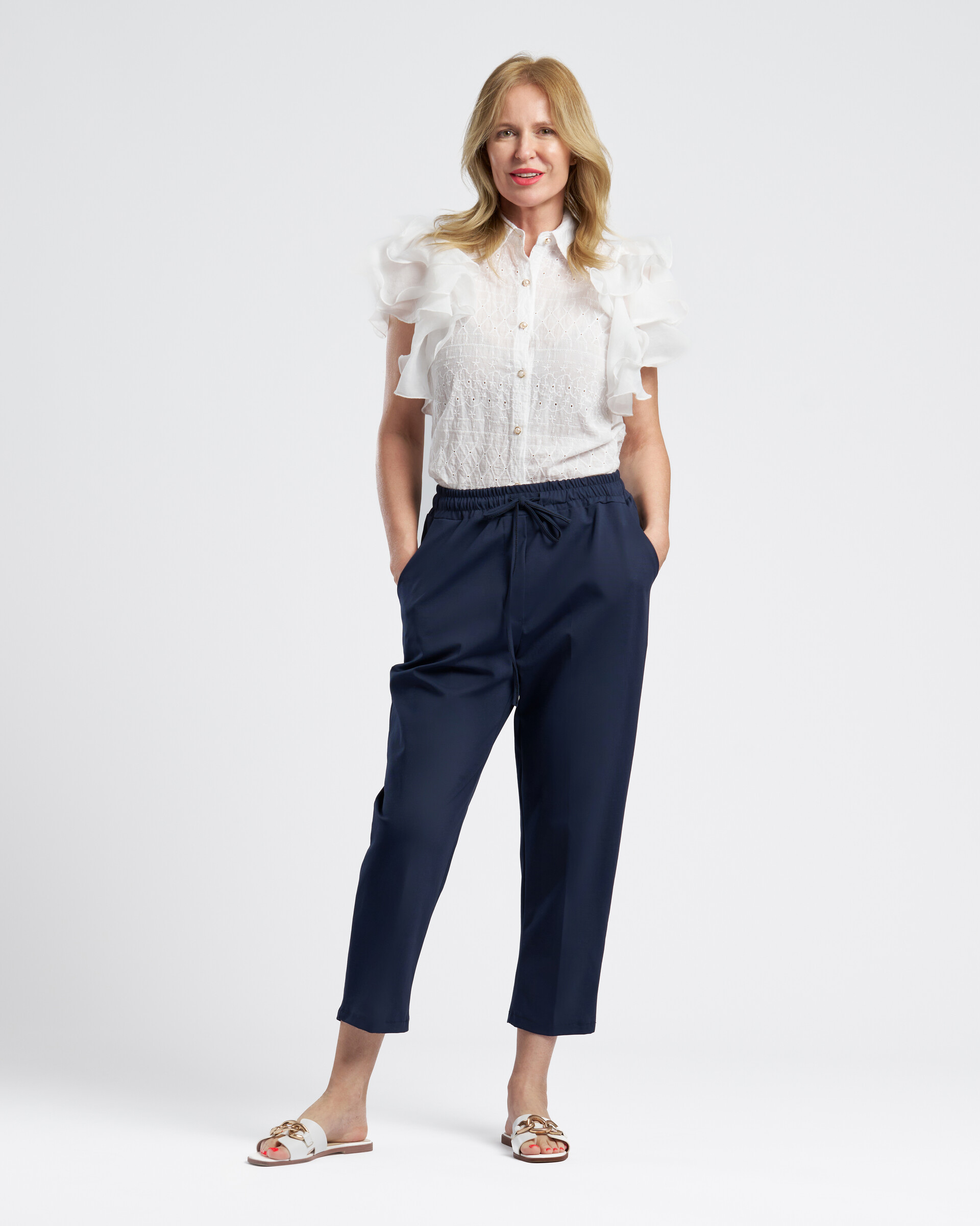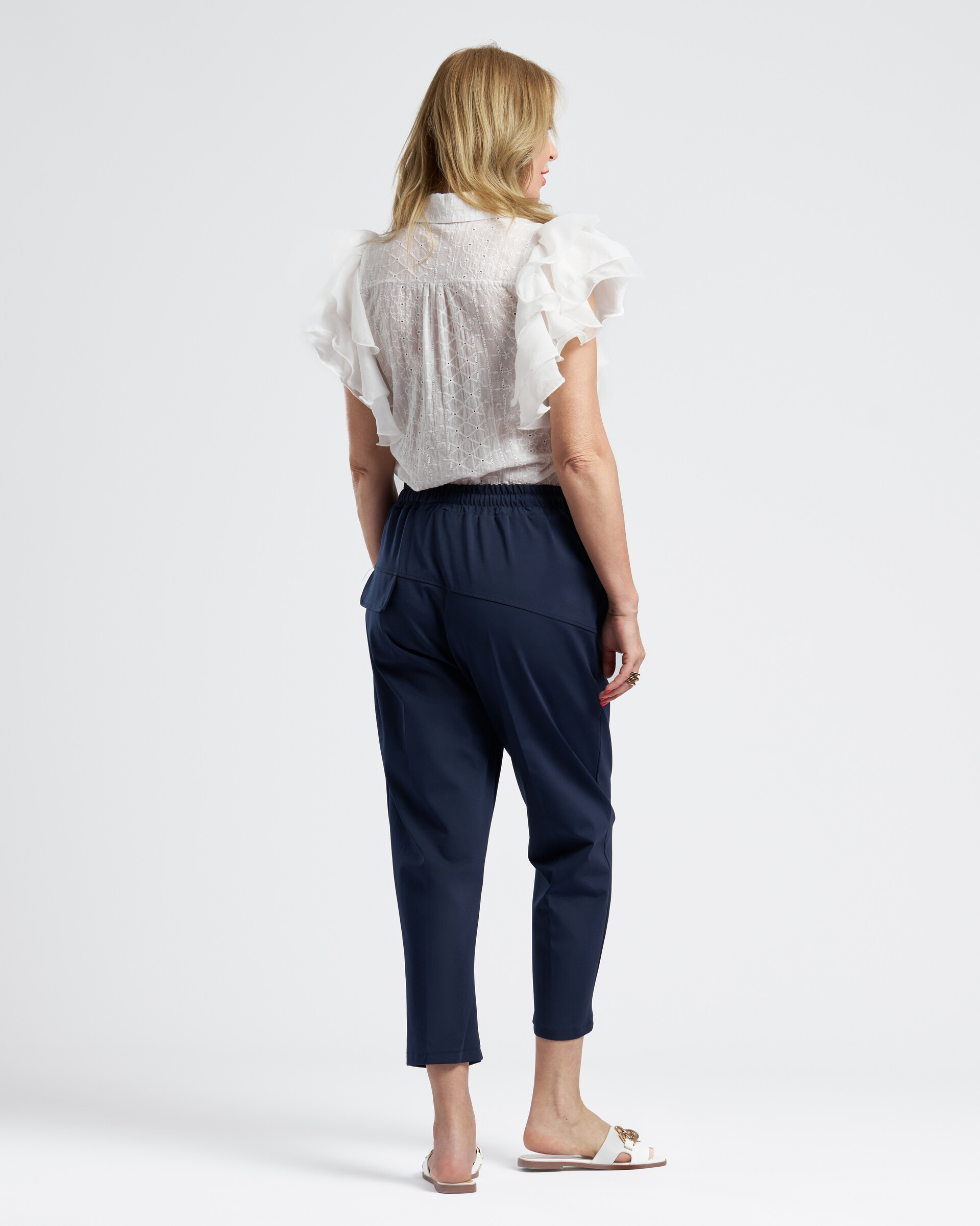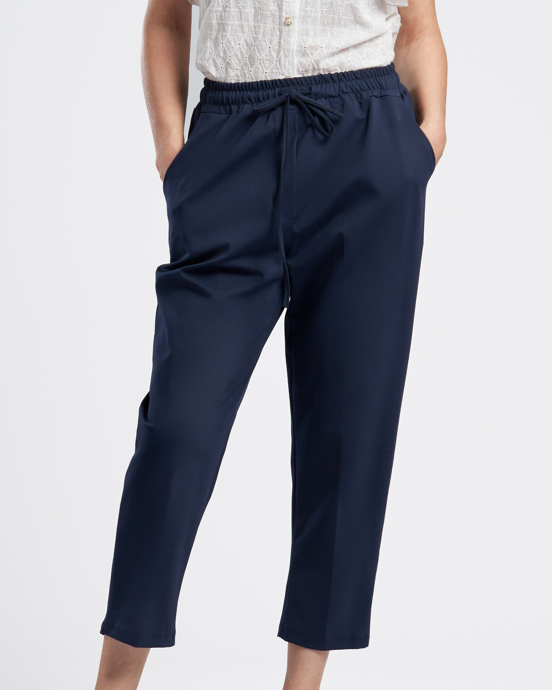 Kék laza sportos pamut nadrág, gumis derékkal, oldal zsebekkel, hátul 1 dísz zsebbel