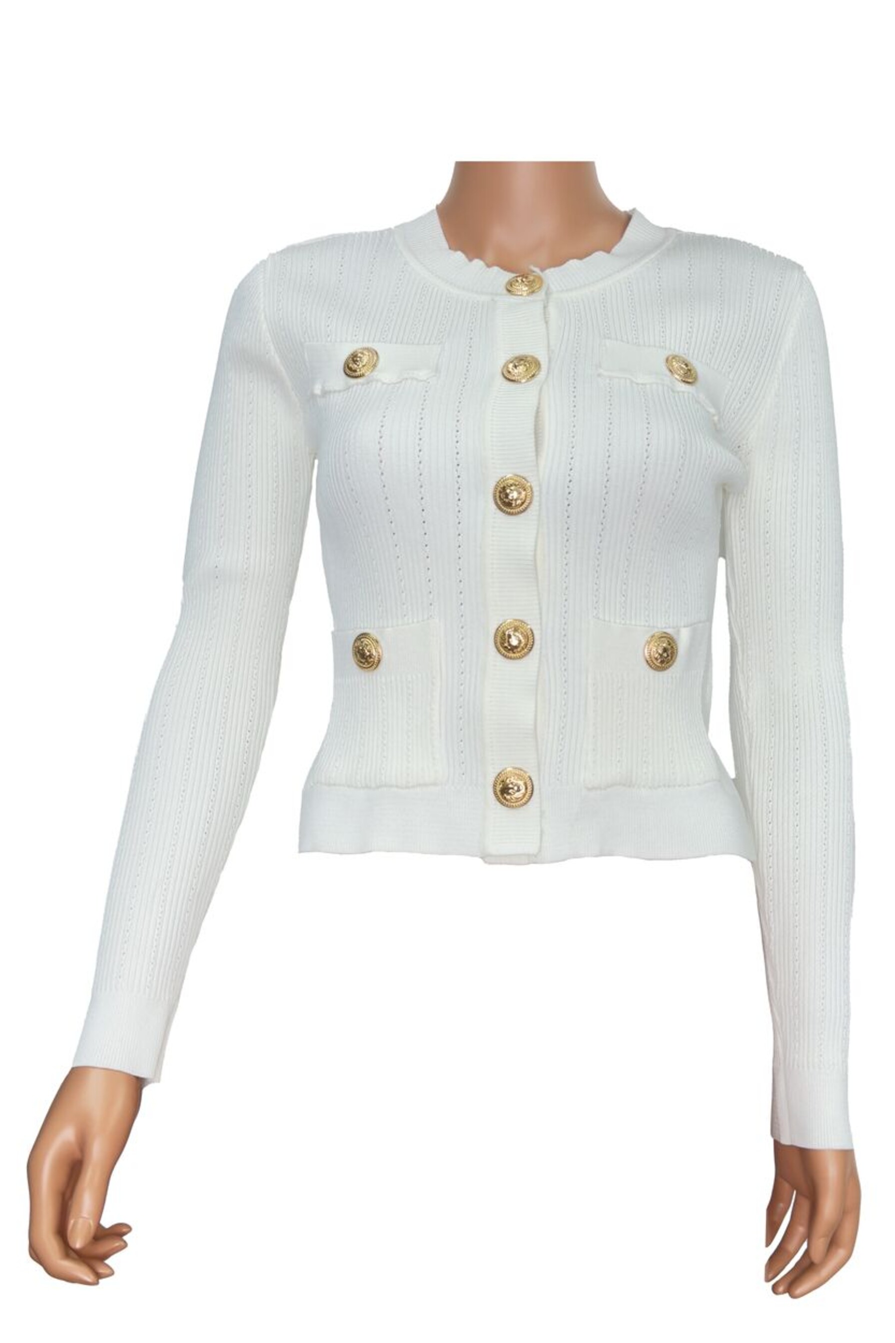 Kötött kardigán arany gombokkal. Rugalmas anyagú, így XS-L-es méretig ajánlott.