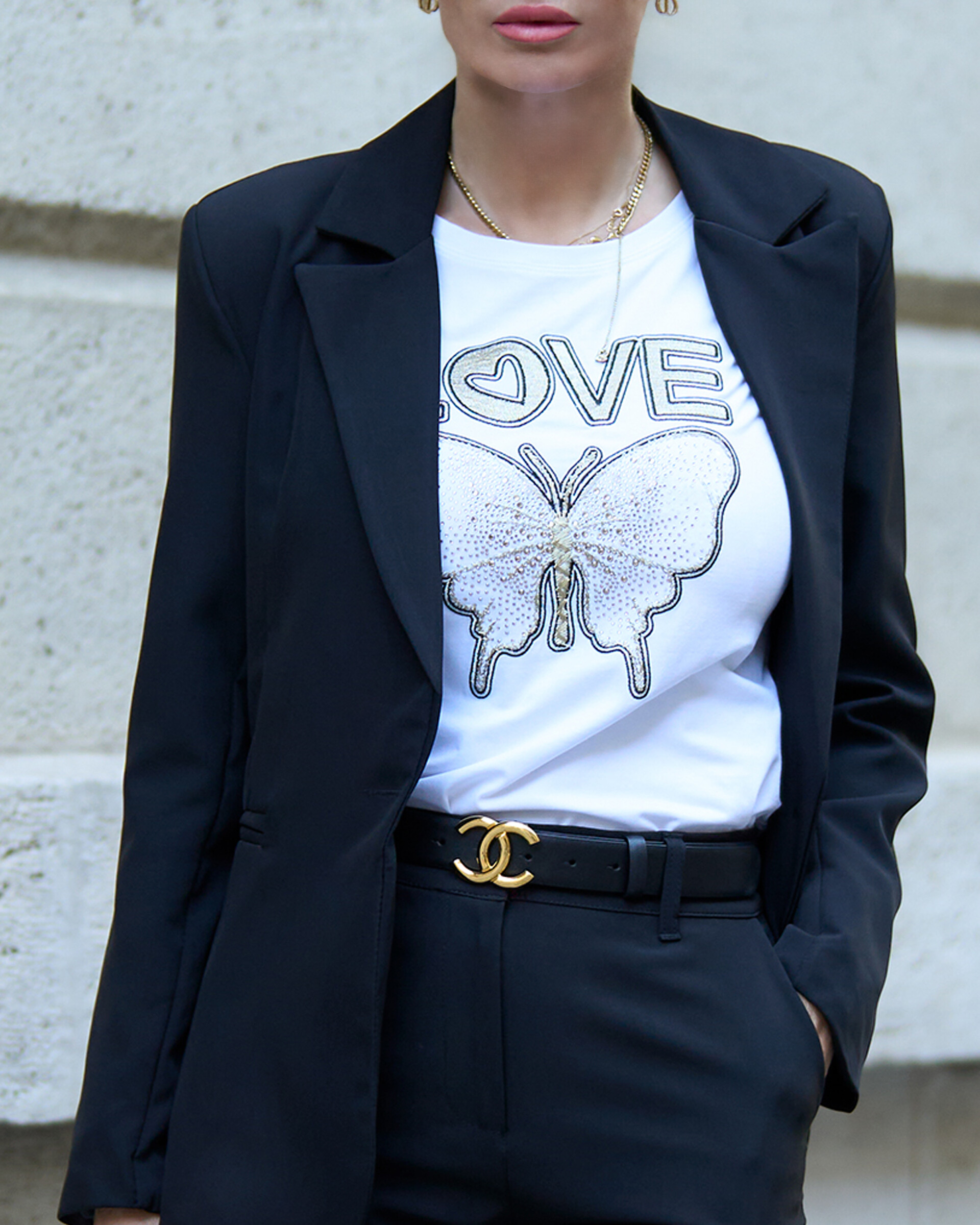 Love feliratos póló kristályokkal kirakott lepke mintával, vállán arany díszgombokkal