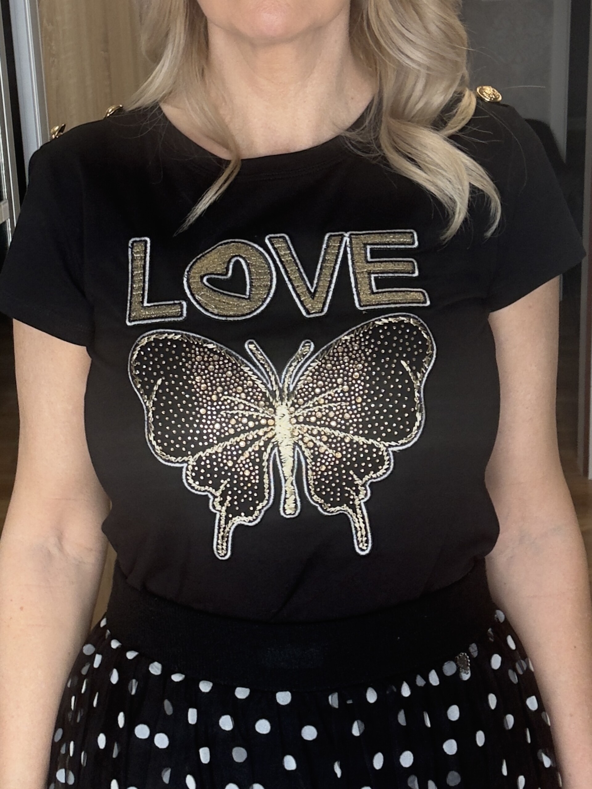 Love feliratos póló kristályokkal kirakott lepke mintával, vállán arany díszgombokkal