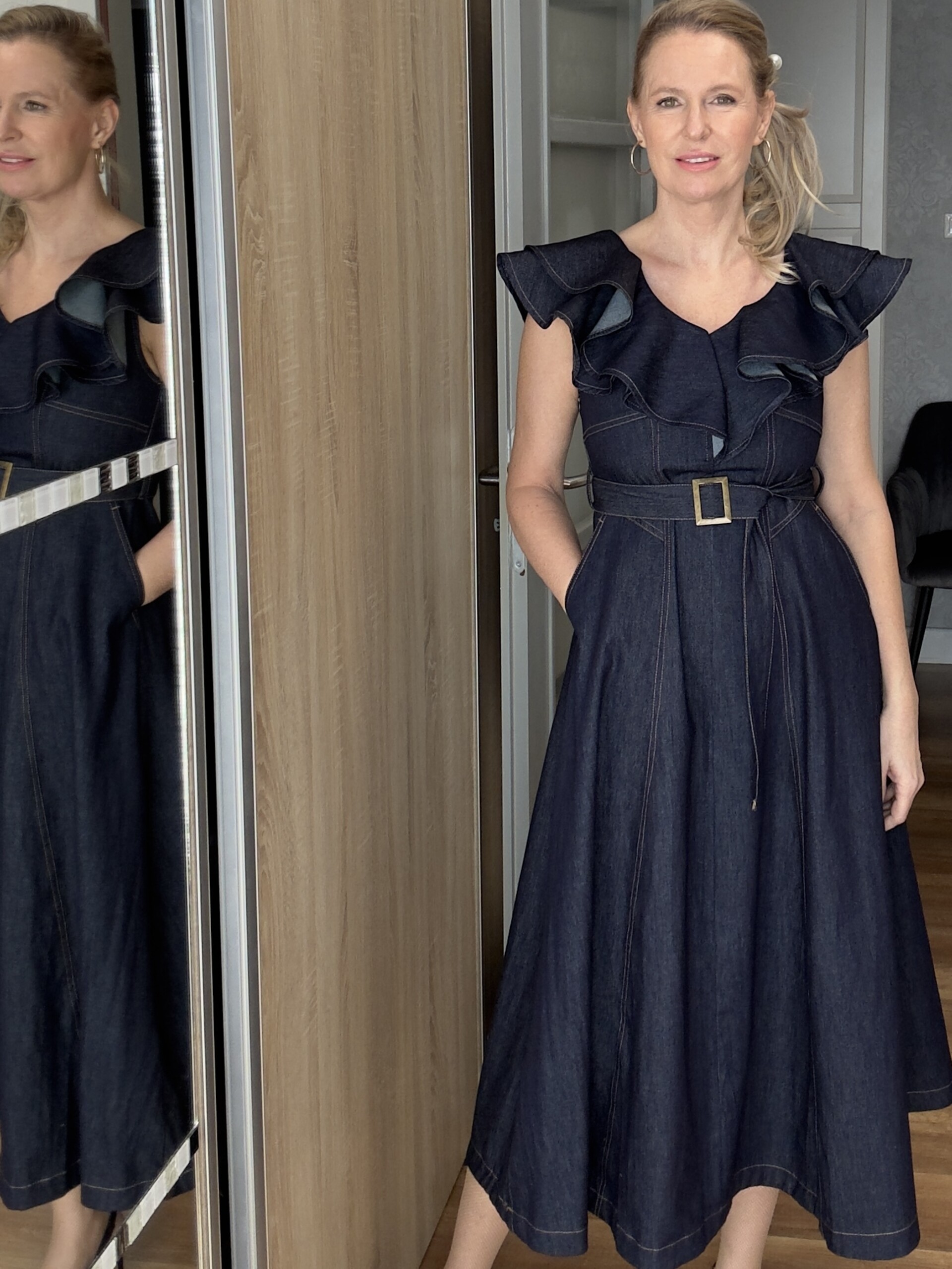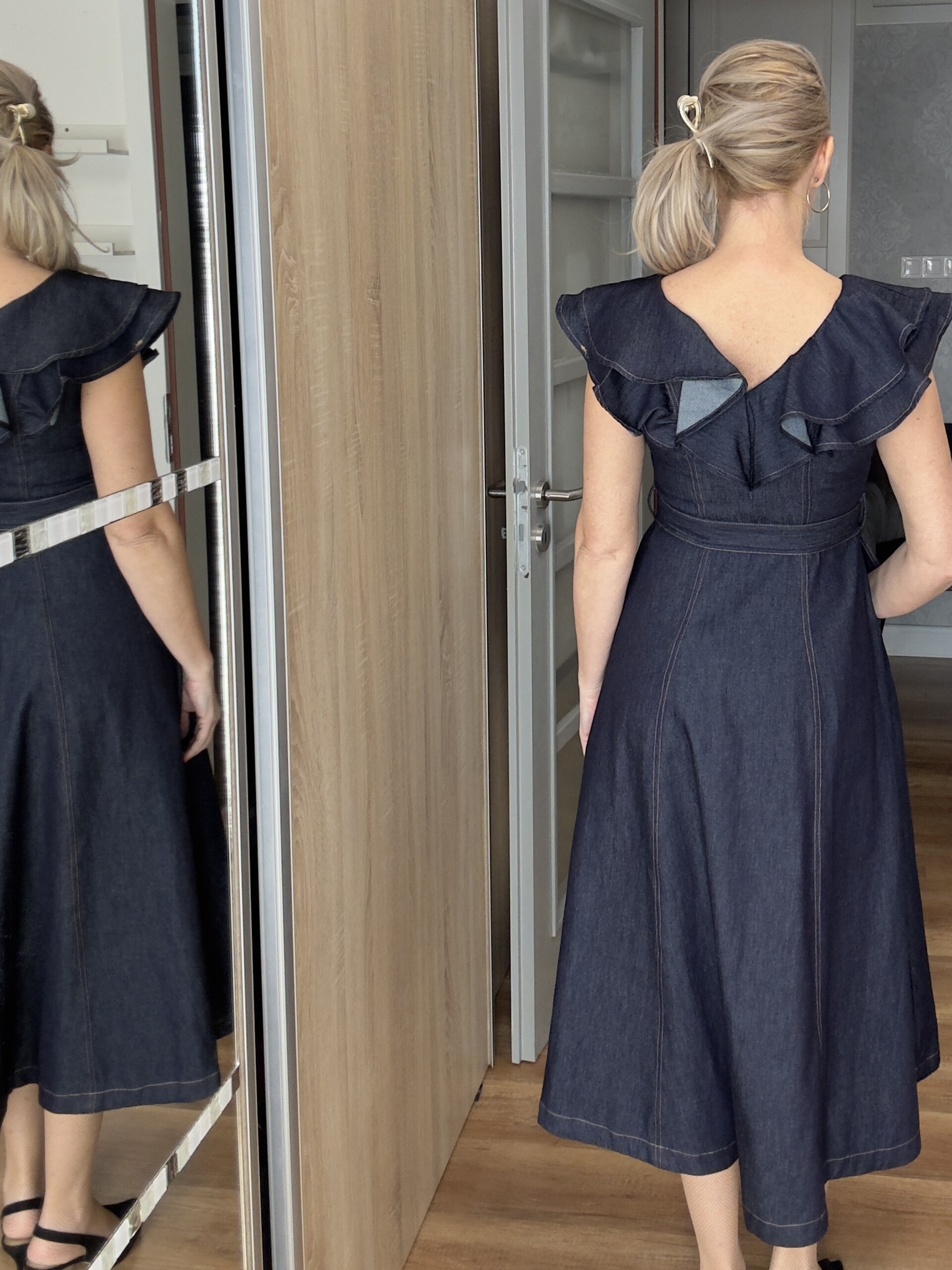 V-nyakú fodros farmer ruha