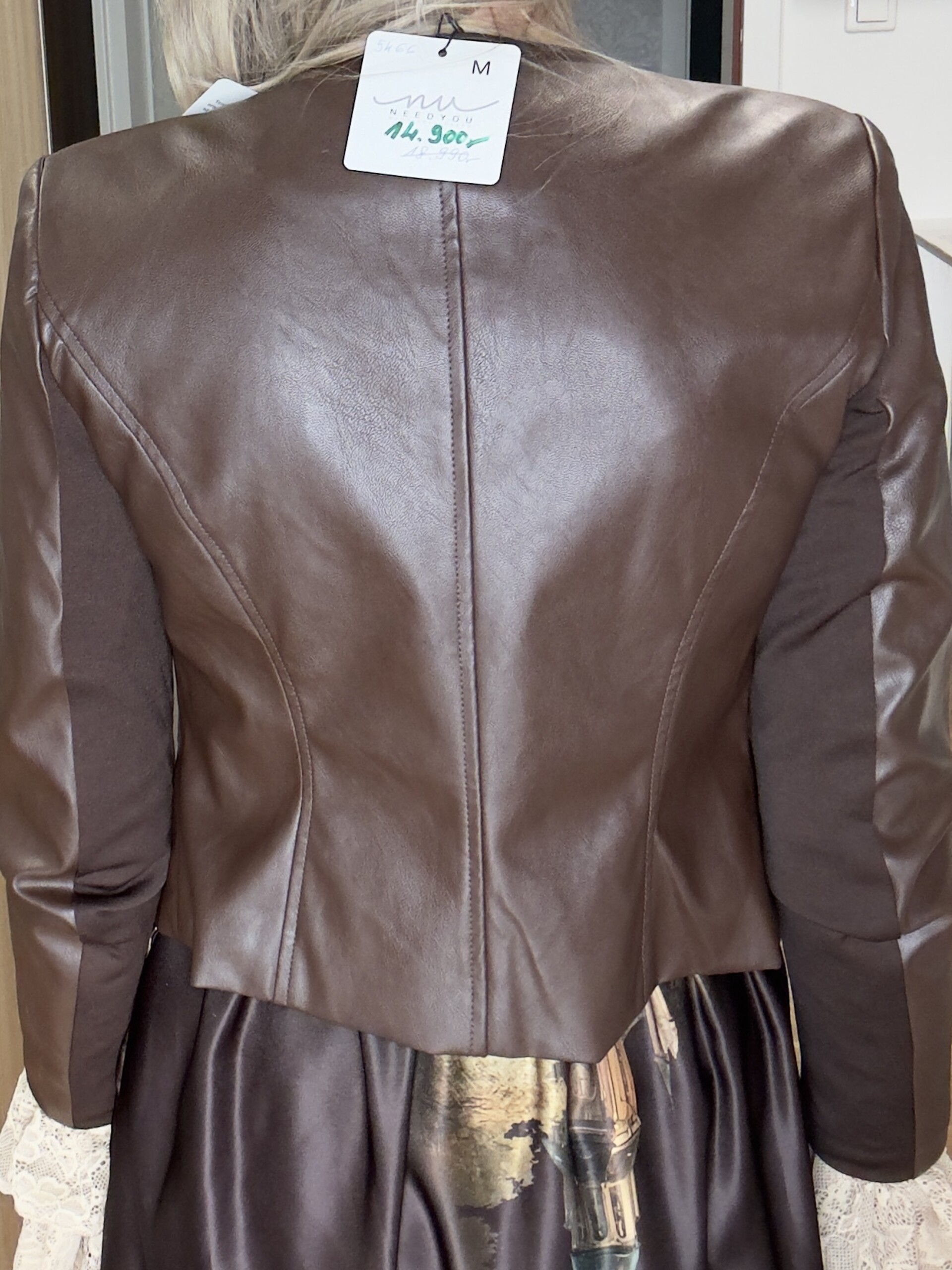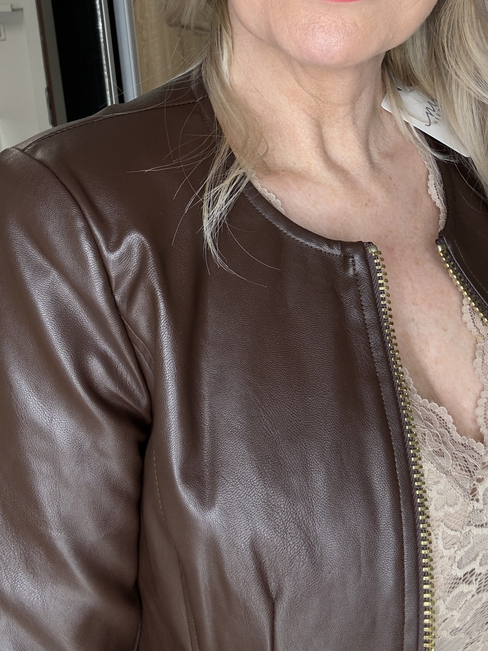 Szintetikus bőrből készült rövid dzseki, kerekített nyakkal, arany cipzárral, ujján rugalmas textil betéttel bézs és fekete színekben